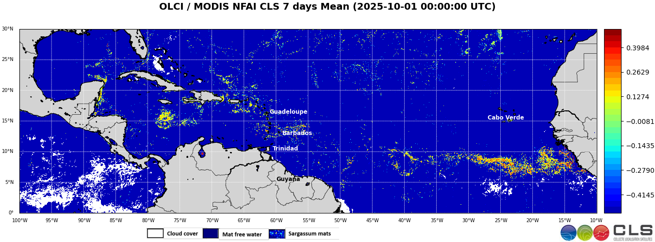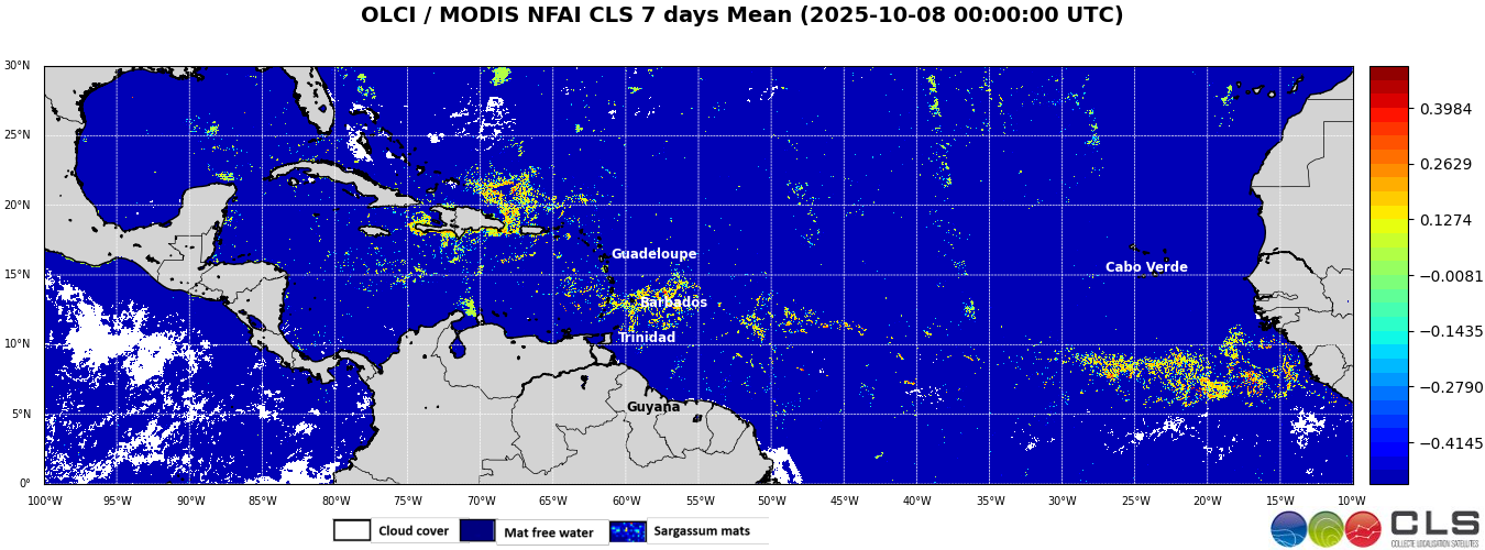 Weekly average of the 300-m resolution CLS NFAI Sargassum Index combining Sentinel-3/OLCI and Aqua/MODIS optical sensors. Dark blue shows waters without any Sargassum detection. Green to Red show sargassum presence over one week. White shows remaining cloud cover.